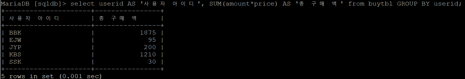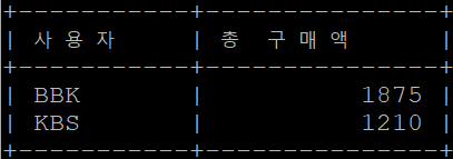 SELECT userid AS '์ฌ์ฉ์', SUM(price*amount) AS '์ด ๊ตฌ๋งค์ก' FROM buytbl GROUP BY userid HAVING SUM(price*amount) > 1000;