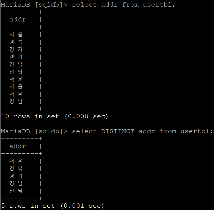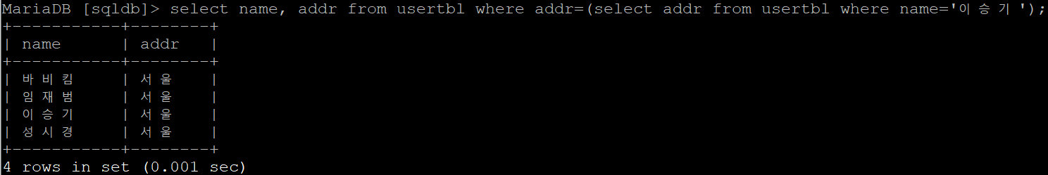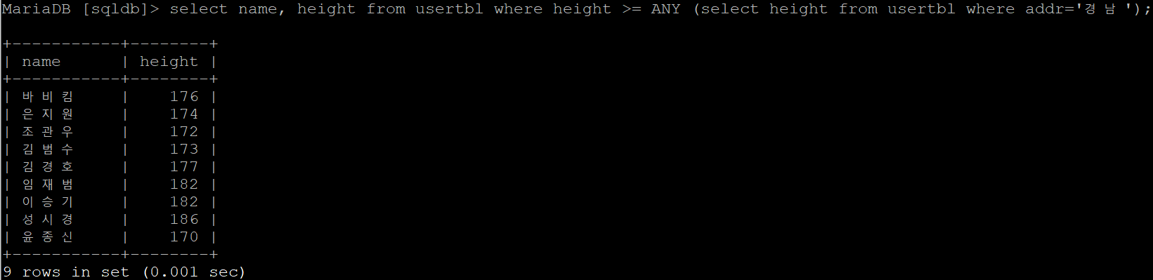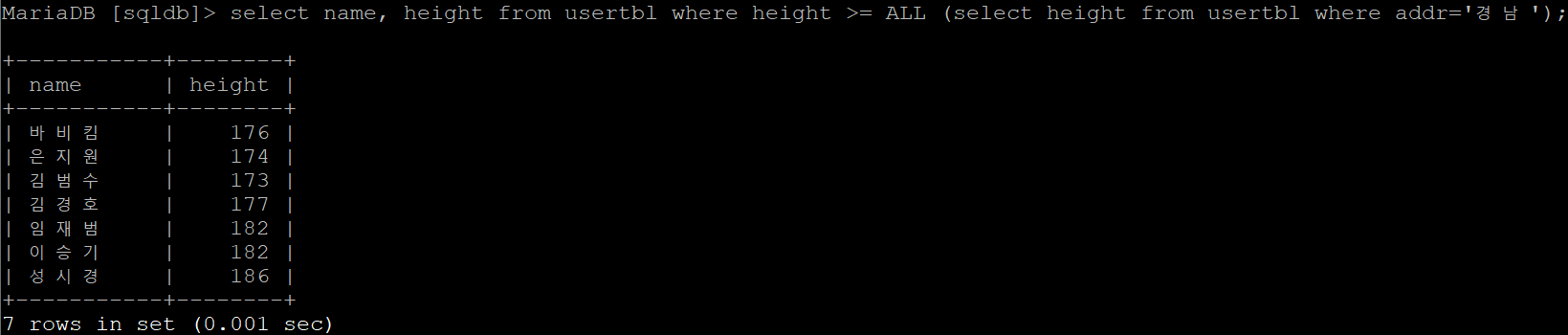 WHERE height >= ANY (SELECT height FROM usertbl WHERE addr='๊ฒฝ๋จ');