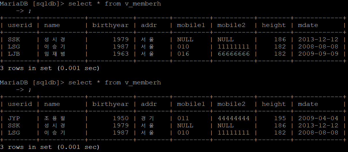CREATE VIEW v_memberh AS SELECT * FROM usertbl ORDER BY height DESC LIMIT 3;