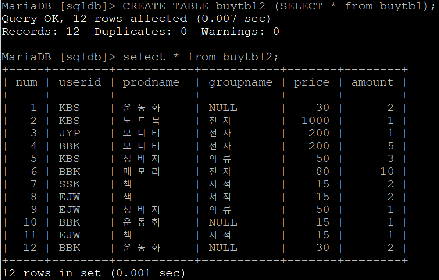- buytbl๊ณผ ๋ด์ฉ์ด ๋๊ฐ์ ํ ์ด๋ธ ์์ฑ