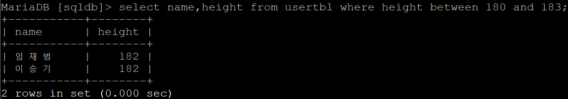 SELECT name, height FROM usertbl WHERE height BETWEEN 180 AND 183;