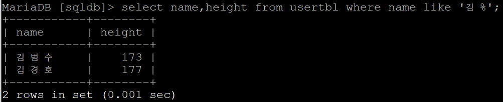 SELECT name, height FROM usertbl WHERE name LIKE '๊น%';