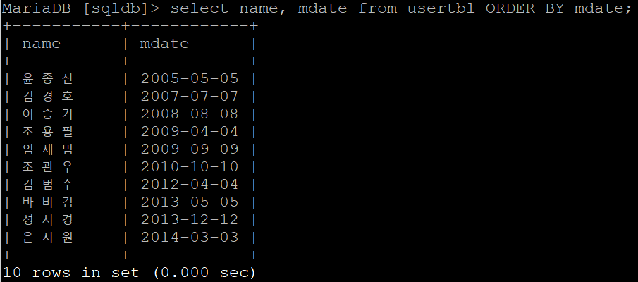SELECT name, mdate FROM usertbl ORDER BY mdate;